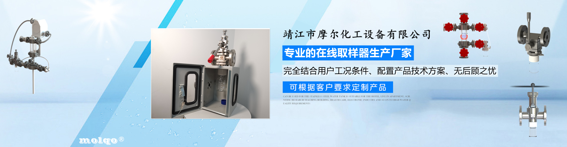 靖江市摩爾化工設(shè)備有限公司位于蘇中明珠——江蘇省靖江市城南工業(yè)園區(qū)東進路北側(cè)天元艾爾瑞內(nèi),另有生產(chǎn)基地位于靖江市經(jīng)濟技術(shù)開發(fā)區(qū)新號路1號鼎電科技園內(nèi)。我公司由數(shù)名長期從事化工生產(chǎn)、氟塑襯里模具開發(fā)以及機械自控設(shè)備的專業(yè)人員共同合作成立,致力于提供客戶最優(yōu)的高效在線取樣、反應(yīng)及精餾分離設(shè)備,為客戶提供合理的設(shè)備選型方案,以幫助客戶提高綜合生產(chǎn)效率以及改善生產(chǎn)現(xiàn)場環(huán)境為目標(biāo)。 本公司主要制造及銷售的產(chǎn)品有:釜用在線取樣裝置,管道取樣閥,釜用清洗噴淋裝置、搪玻璃設(shè)備、GMP專用搪玻璃設(shè)備、氟塑襯里設(shè)備、攪拌器、釜用機械密封、氣動閥門及搪玻璃管道、襯氟閥門管道、非標(biāo)不銹鋼容器,精餾塔塔器、片式冷凝器及PTFE密封件、鋯、鈦、鉭、鎳等加工件制品。我司是一家集研發(fā)銷售、設(shè)計咨詢服務(wù)于一體的專業(yè)···